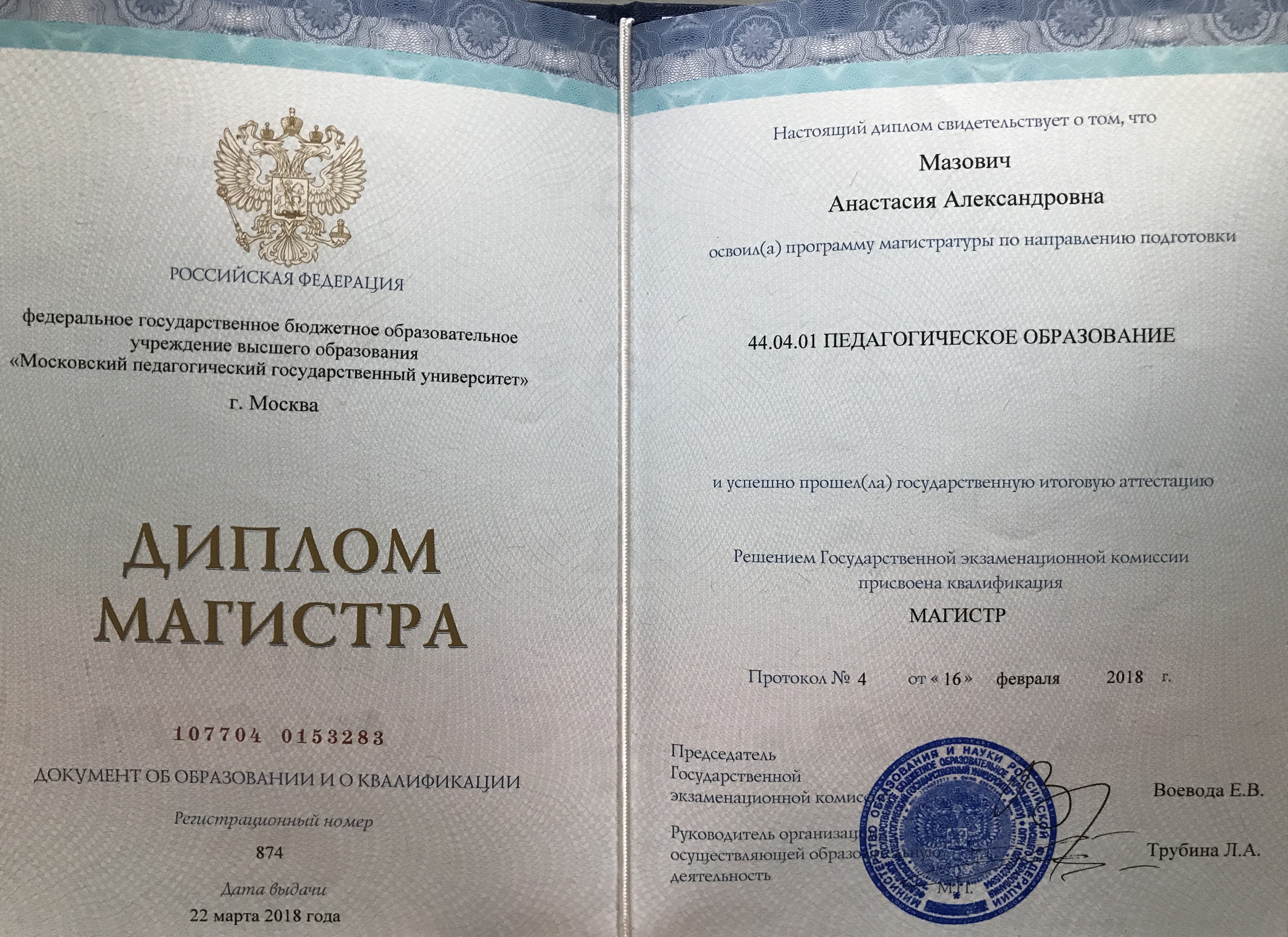 МПГУ (город Москва), педагогическое образование, магистр, 2018 год.