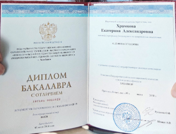 - Образование: Южно-Уральский Государственный Университет, "Политология", диплом с отличием, бакалавр, 2018 год.