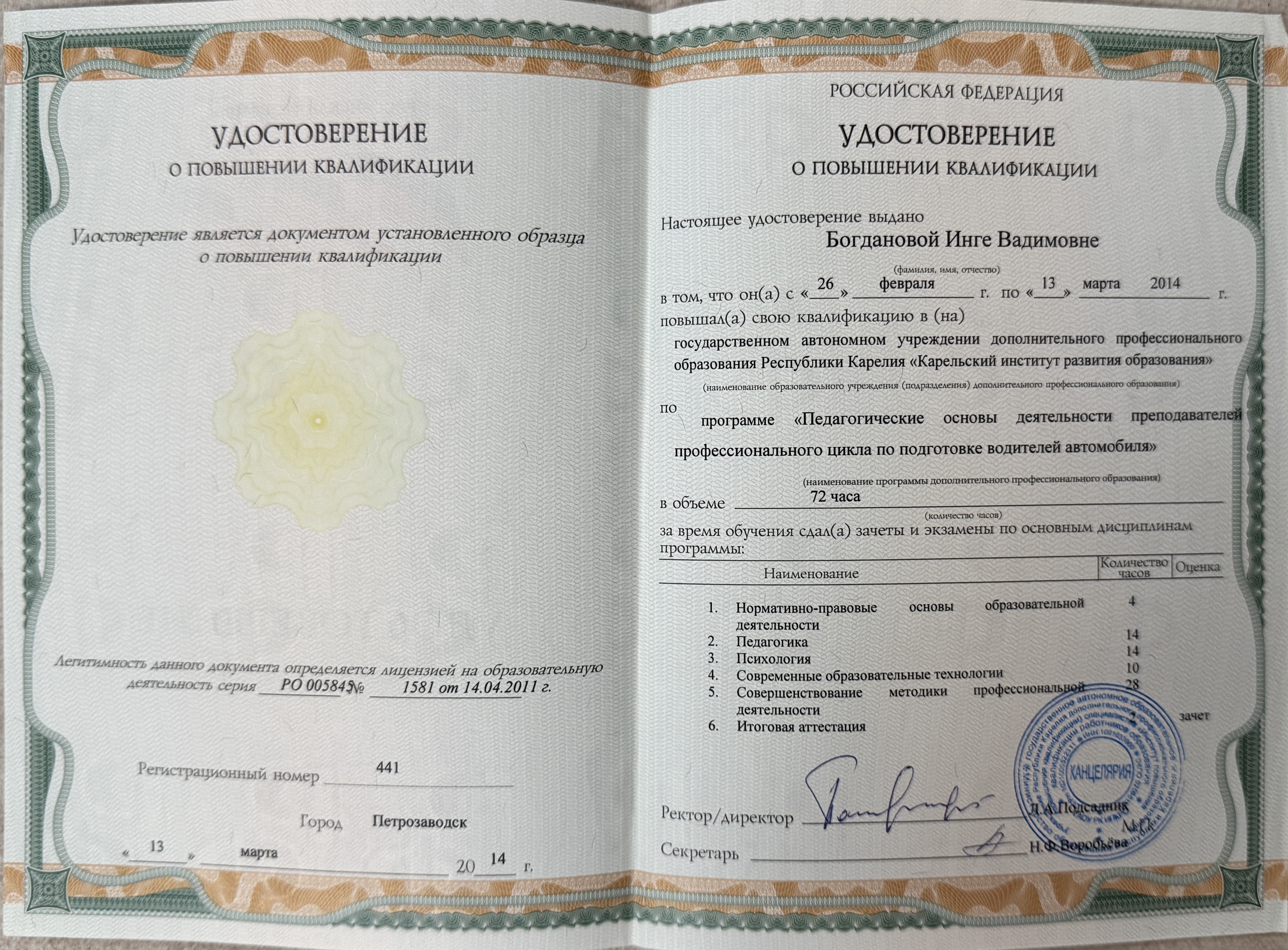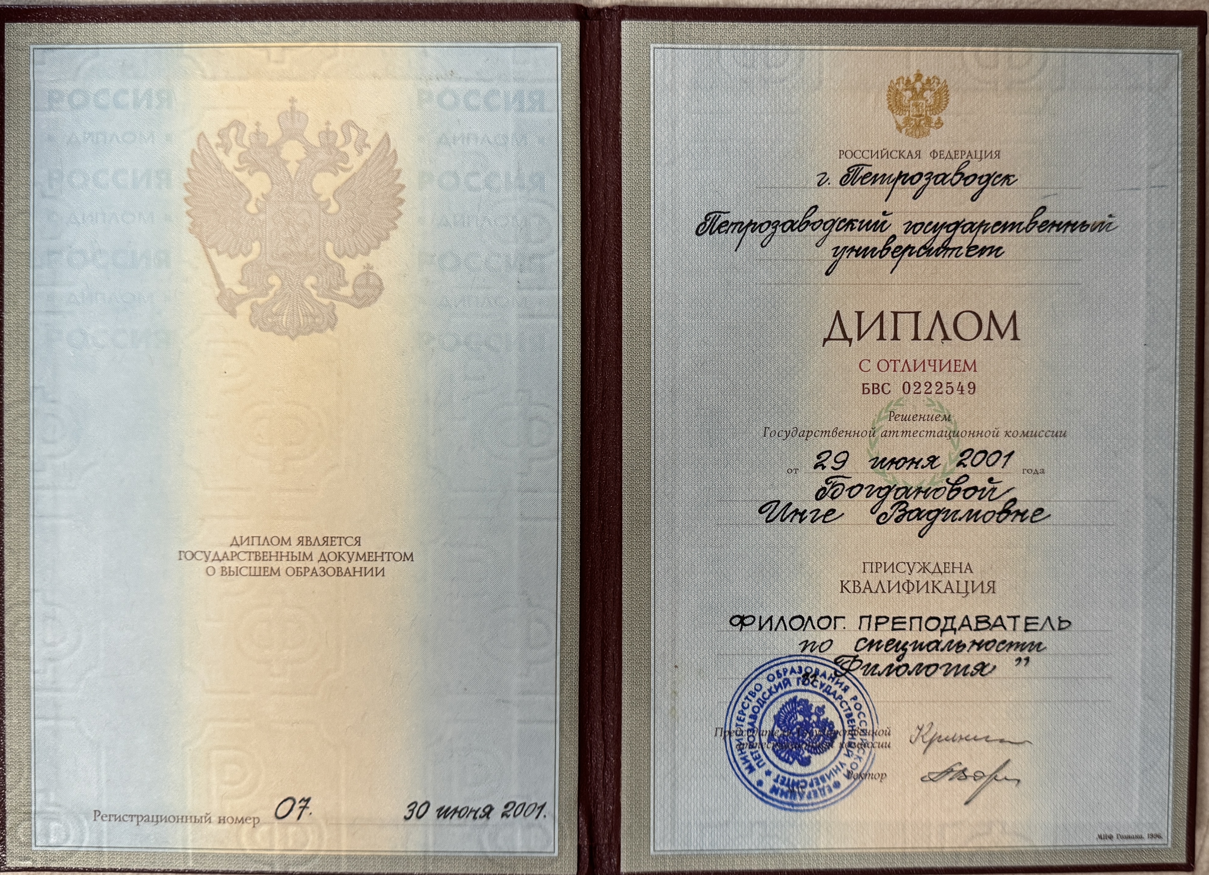 - Образование: Высшее образование, Петрозаводский Государственный Университет, "Филолог. Преподаватель", красный диплом, специалист, 2001 год.