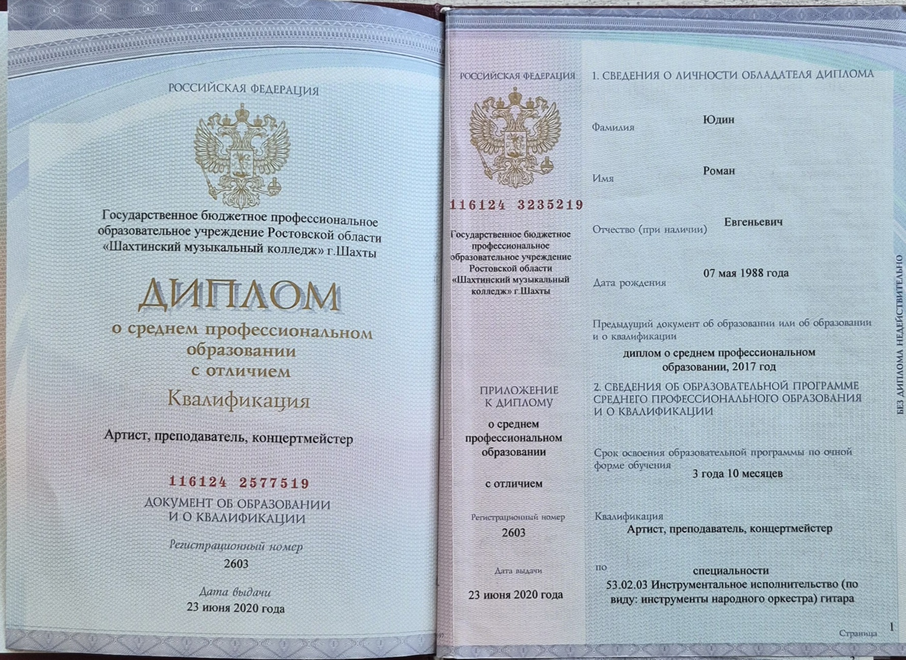- Образование: Среднее специальное, "Шахтинский музыкальный колледж", артист, преподаватель, концертмейстер, 2020 год.