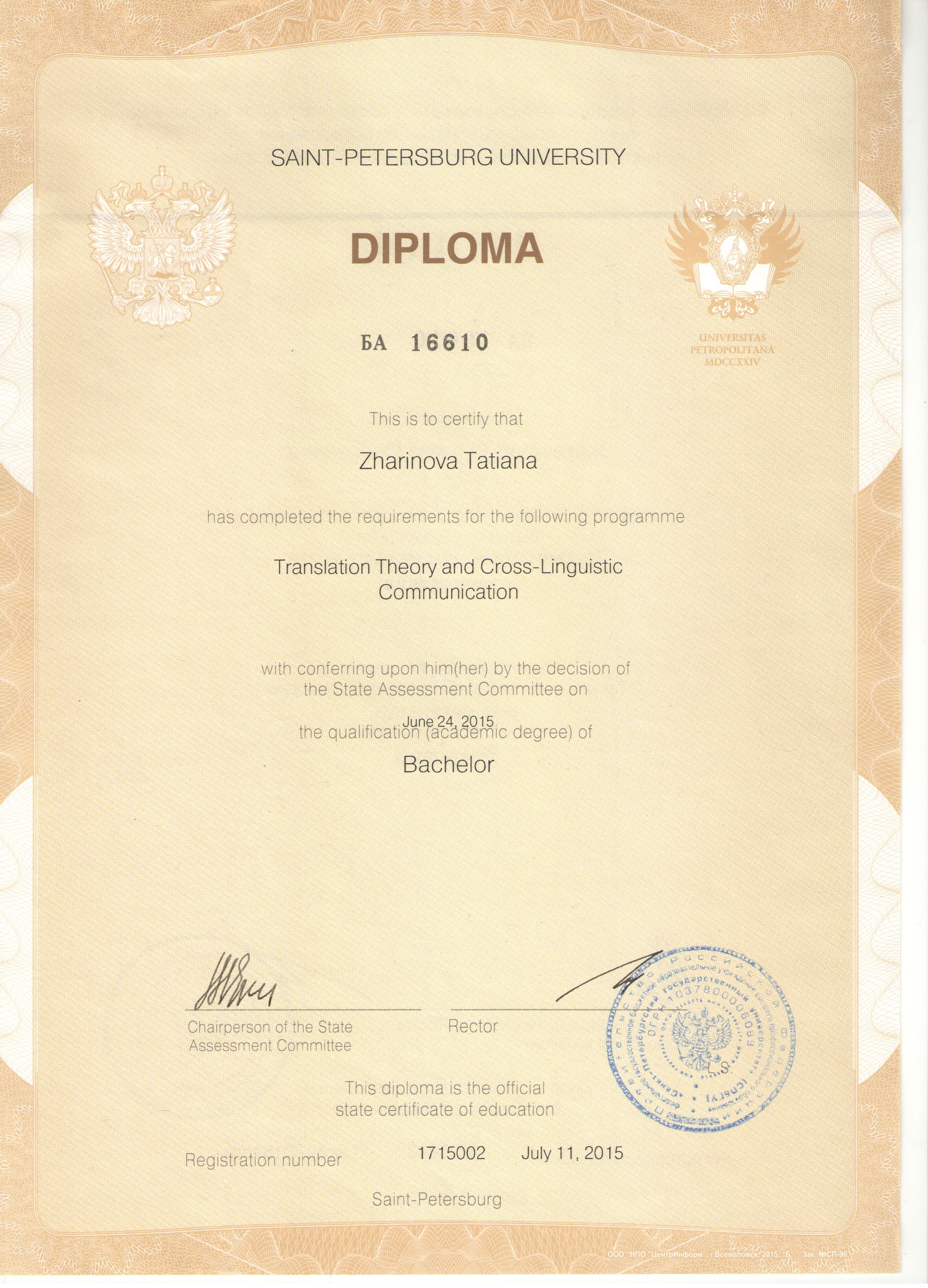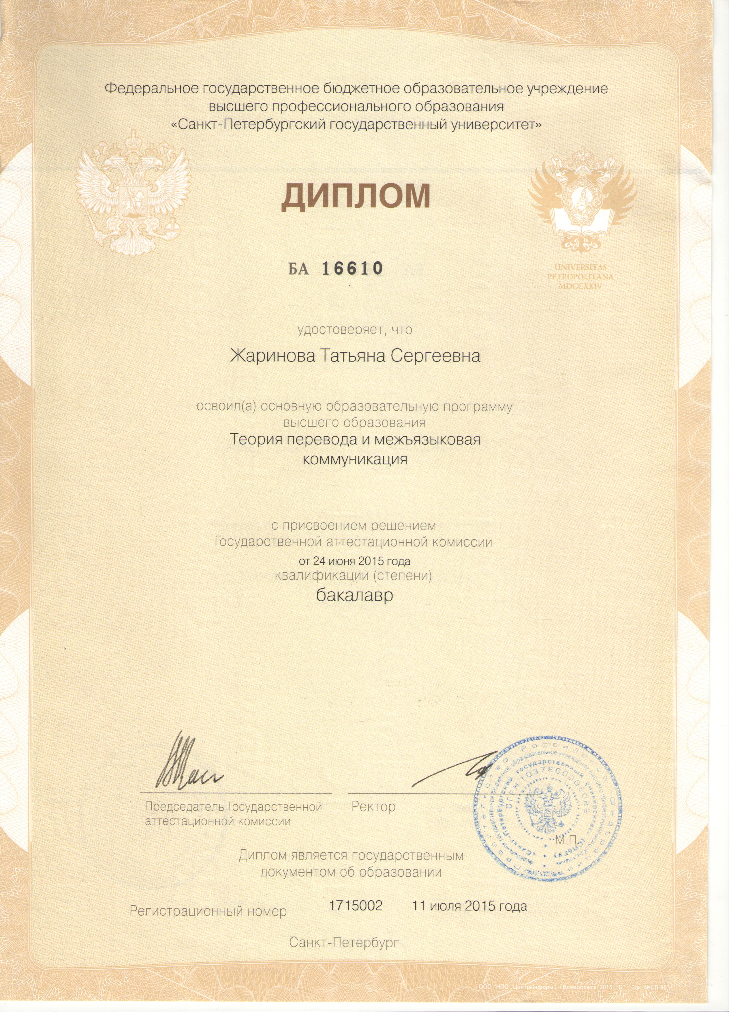 - Образование: СПбГУ, филологический факультет, "Теория перевода и языковая коммуникация", бакалавр, 2015 год.