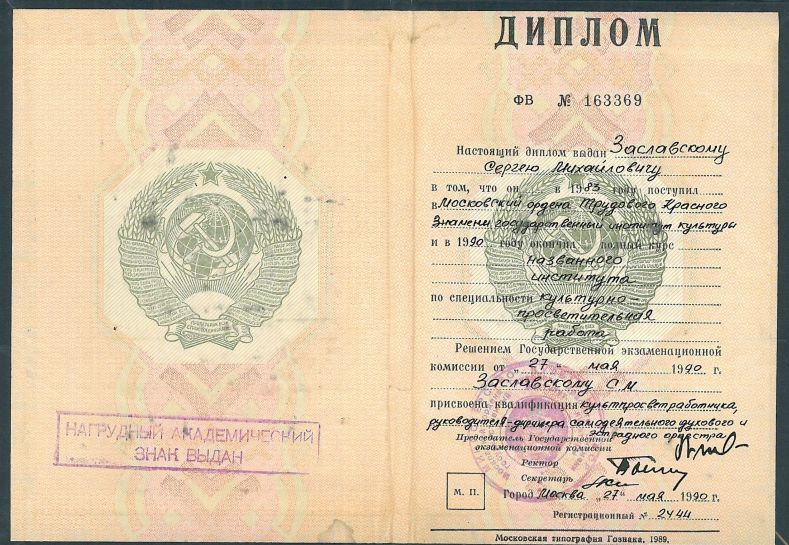 - Образование: Московский ордена Трудового Красного Знамени Государственный Институт Культуры, "Культпросветработник, руководитель - дирижёр самодеятельного духового и эстрадного оркестра, 1990 год.