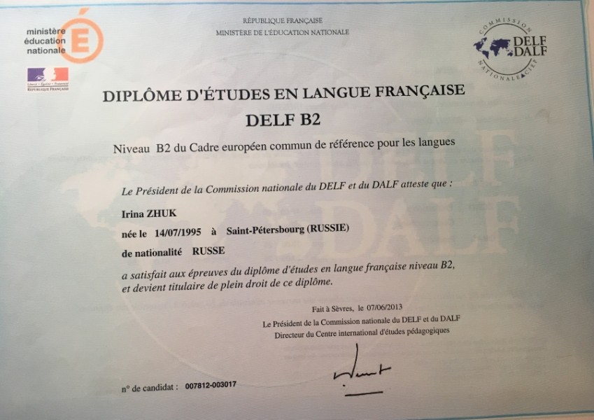 Имею сертификат о сдаче международного экзамена по французскому языку DELF, уровень B2. Призёр олимпиад по французскому языку.