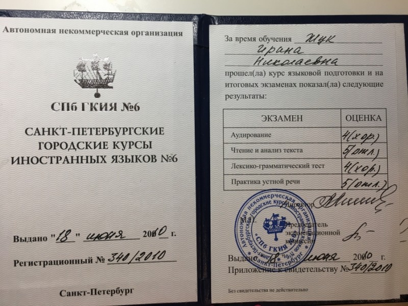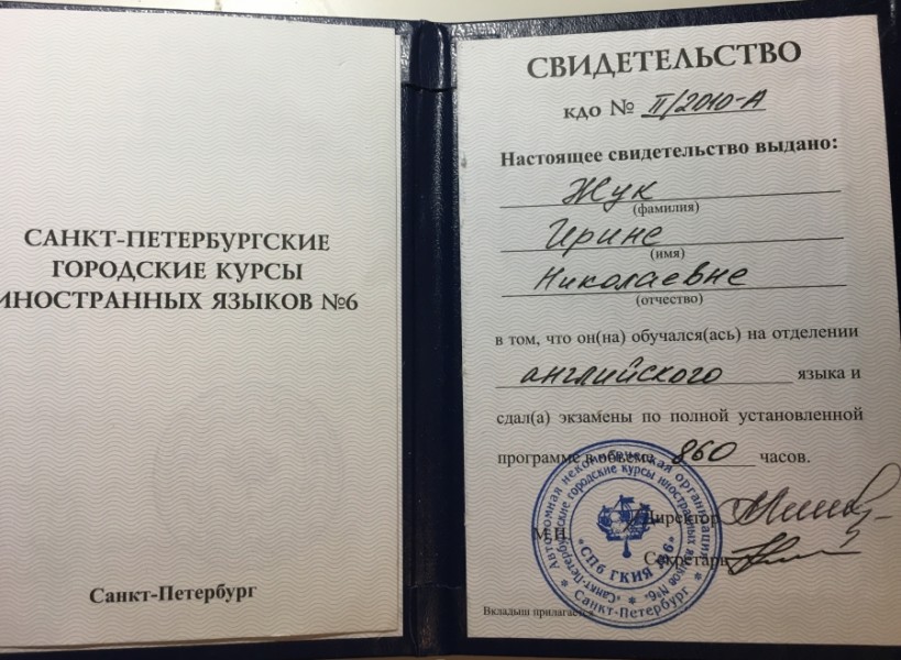 Окончила государственные курсы по английскому языку СПб ГКИЯ .