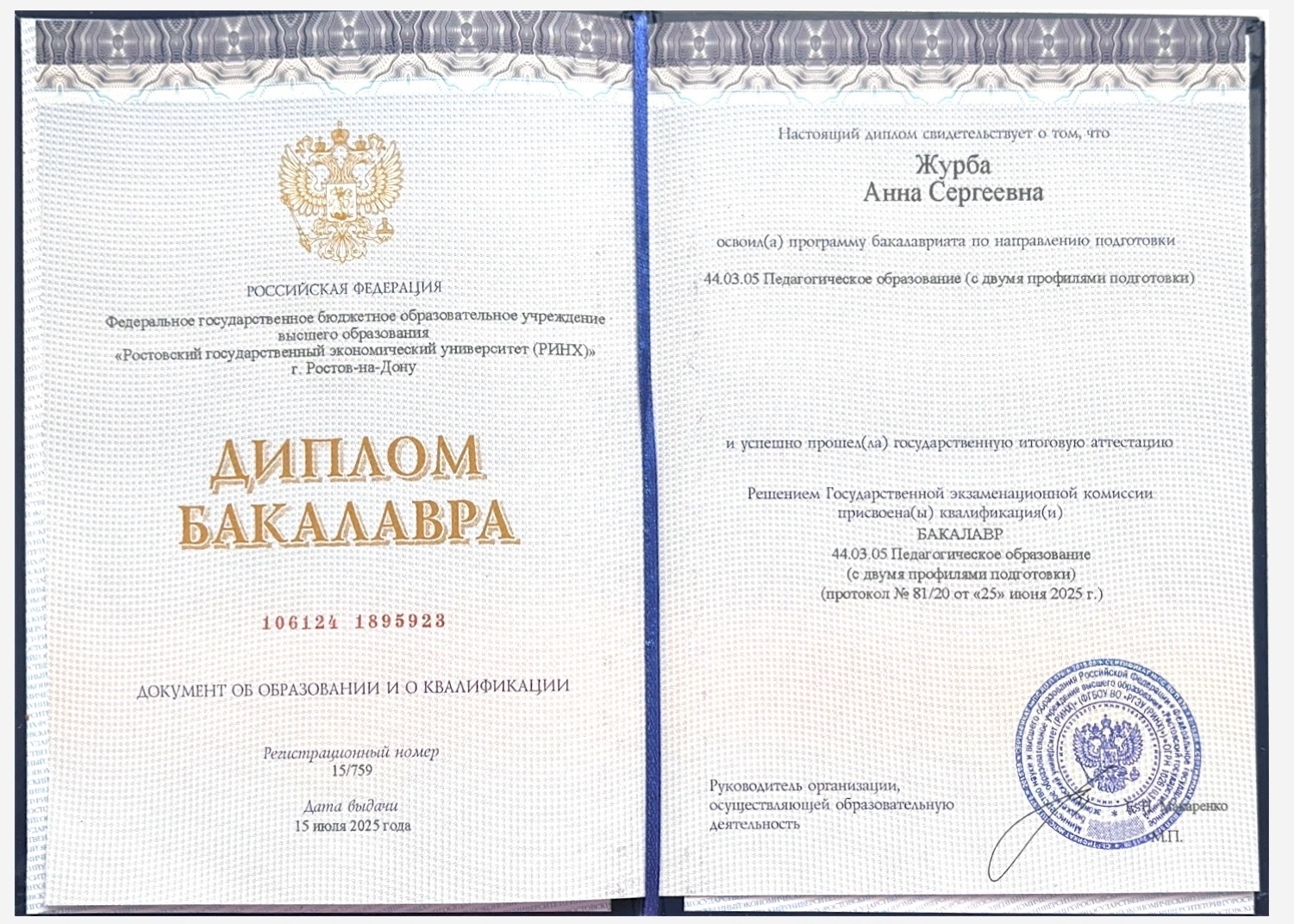 - Образование: Таганрогский Институт имени А. П. Чехова (филиал Ростовского Государственного Экономического Университета), факультет истории и филологии, "Педагогическое образование (с двумя профилями подготовки)", бакалавр, 2025 год.